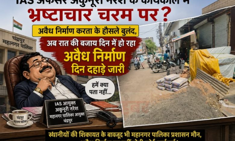 चंद्रपुर :- चंद्रपुर शहर महानगर पालिका में चंद महीनों पहले आयुक्त पद का पदभार संभालने वाले पहले IAS अफसर अकुनूरी नरेश के कार्यकाल में चंद्रपुर महानगर पालिका प्रशासन भ्रष्टाचार के मामले में चरम पर दिखाई दे रहा है। इस IAS आयुक्त के कार्यकाल में अवैध निर्माण करता बेलगाम नजर आ रहे है। और महानगर पालिका प्रशासन अवैध निर्माण और भ्रष्टाचार के मामले में नया अध्याय लिखने जा रहा है? रात के समय में चलने वाला अवैध निर्माण अब दिन दहाड़े शुरू हैं। IAS आयुक्त सहित महानगर पालिका प्रशासन कुंभकरण की नींद में सोता दिखाई दे रहा है। स्थानिकों की शिकायत के बावजूद ऐसे अवैध निर्माण कार्यों पर अगर कार्रवाई नहीं होती तो। सामान्य इंसान किससे शिकायत करे ऐसा सवाल स्थानिकों द्वारा उठाया जा रहा है।